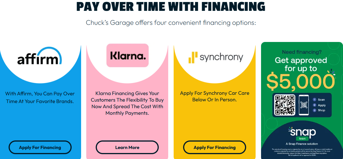 At Chuck's Garage, we offer Affirm, Snap, Synchrony, and Klarna — because when an unexpected breakdown hits, not everyone has the full amount available that same day.